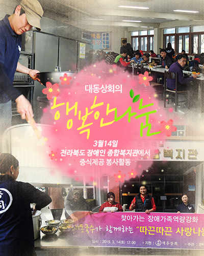 이벤트 | 대동상회의 행복한 나눔 페이지 정보 작성자 최고관리자 작성일15-03-16 16:38 조회2,332회 댓글0건 다음글 목록 본문 3월14일 전라북도 장애인 종합복지관에서 중식제공 봉사활동을 하였습니다. 댓글목록 등록된 댓글이 없습니다. 다음글 목록